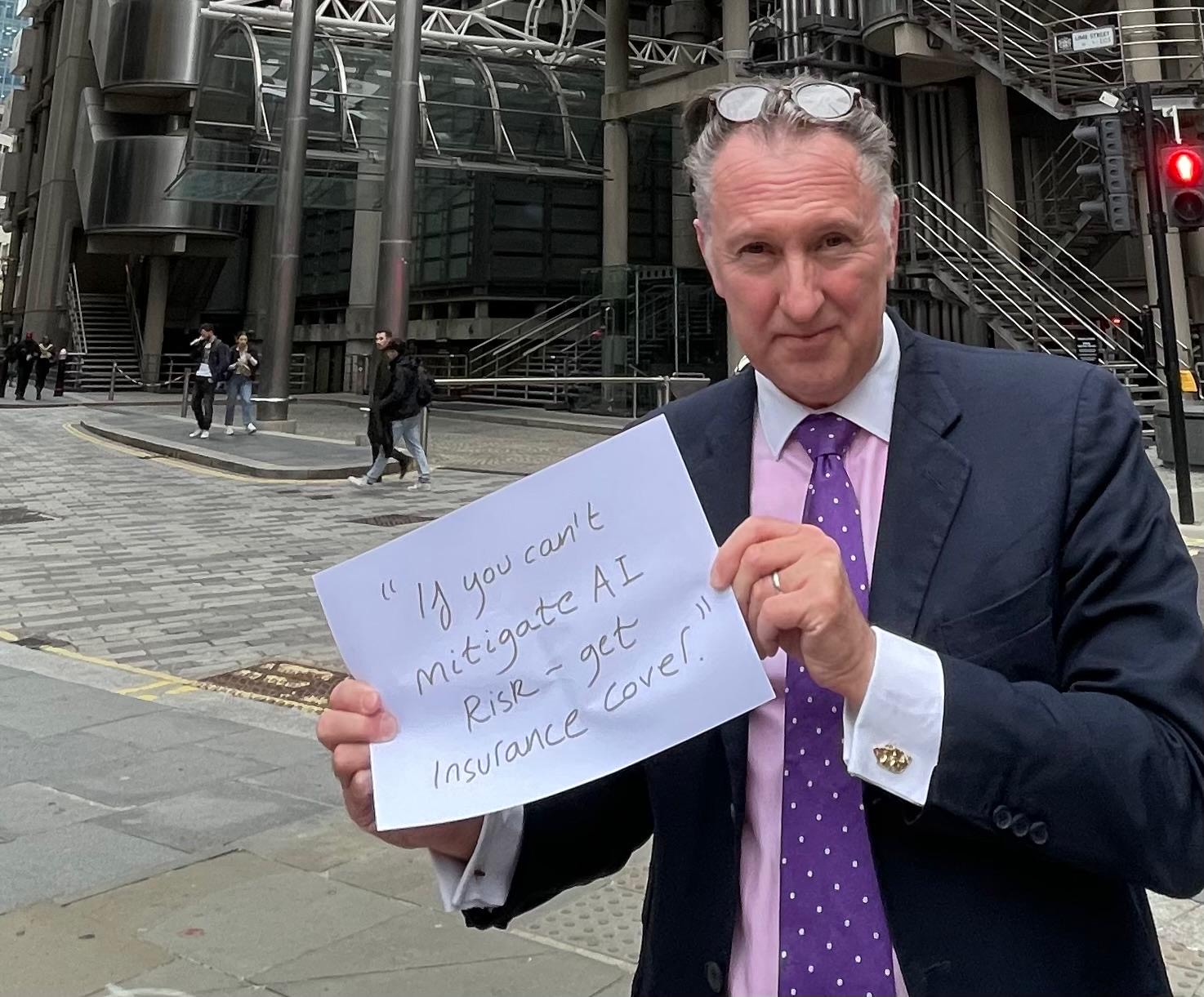 David Clarke, with his slogan, in front of the Lloyds building, the world’s largest insurance marketplace.