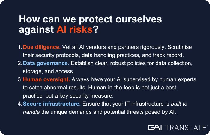 AI introduces new, complex security vulnerabilities that traditional cybersecurity protocols may not address. Businesses need to be aware of four key risks: